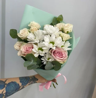 Насыщенный аромат роз и хризантем, словно сочетает в себе все нежное и изящное. Белоснежные и розовые лепестки букета раскрываются, словно медитативный миг вечности. Упаковка из крафтовой бумаги создает ощущение природной простоты и непосредственности, словно букет только что был собран на полях. "Орион" добавит немного чарующей элегантности в вашу жизнь.
